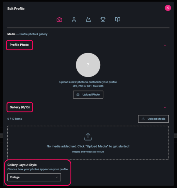Making your Profile public is simple. To get started, add a Profile Photo, a Display Name, and upload a couple of images or videos to your Gallery. You can add up to 10 images to create your Gallery, which appears at the top of your public Profile page. You can choose how these images are displayed by selecting a layout from the Gallery Layout Style drop-down menu at the bottom of the Edit Profile Camera Tab.