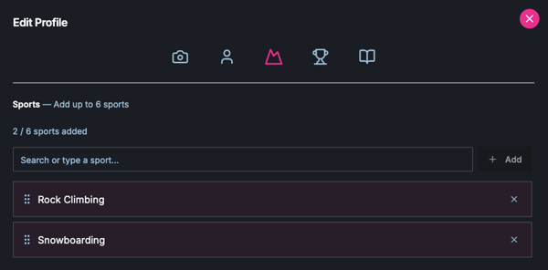 Publishing your profile is just the beginning. Once your Profile Card is created, you have additional opportunities to share more about you and what drives you. We encourage you to enhance your public Profile by adding detail to your Sports(s), Achievements, Story, and Mantra to bring more personality to your identity on the platform. As you make adjustments to your Profile, make sure to click “Save” as applicable. Your Sports and Achievements will automatically save as you add, remove, or reorder them.